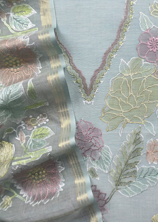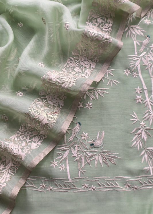 Mint Green Chidiya Embroidered Unstitched Suit In Pure Organza