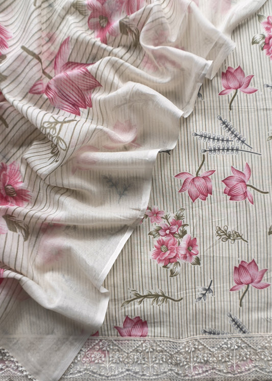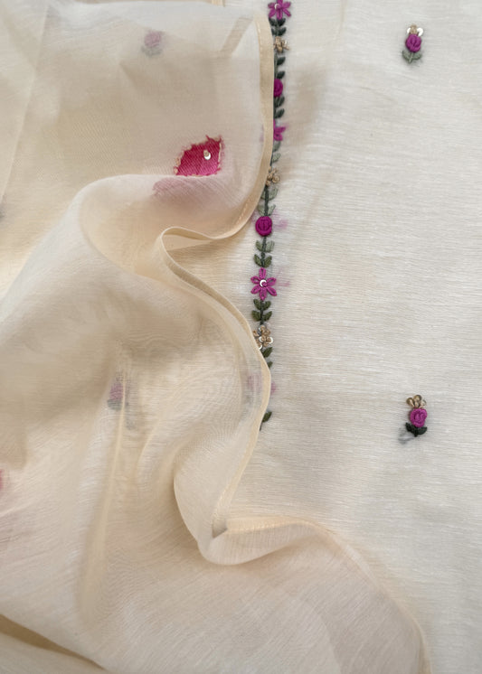 Off White Jamdani Suit With pink Lilies In Chanderi Fabric