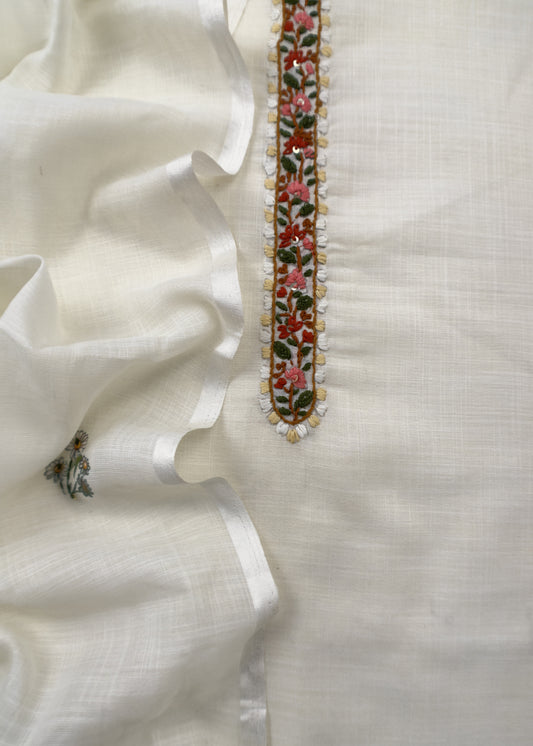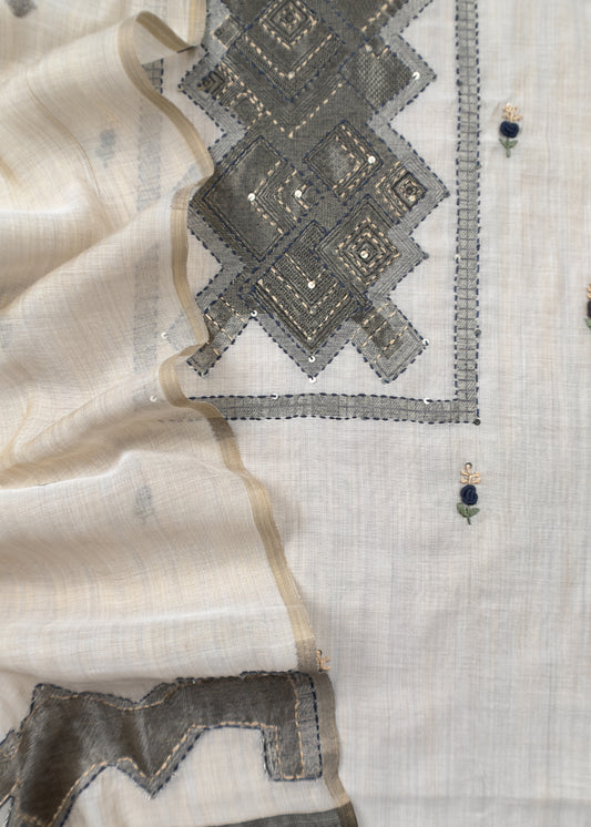 Off White Linen Deer Suit Fabric With Kantha Hand Embroidery