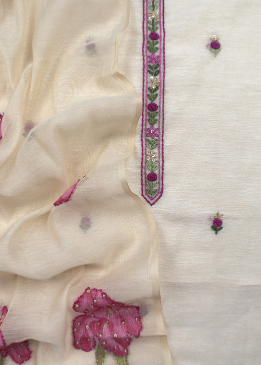Off White Jamdani Suit With Pink Lilies In Chanderi Fabric