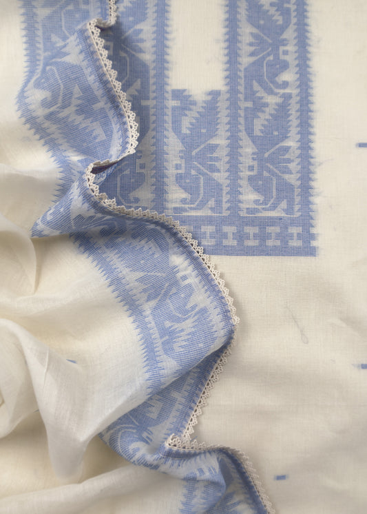 Off White With Blue Cotton Linen Suit With Jamdani Weaving