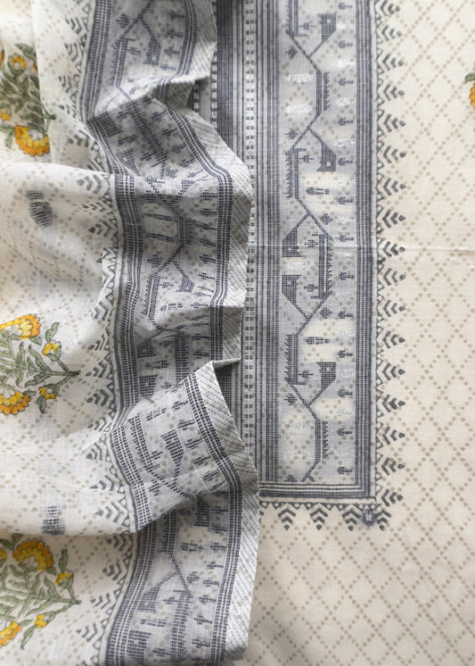 Off White Jamdani Suit With Yellow Daffodil In Linen Chanderi Fabric