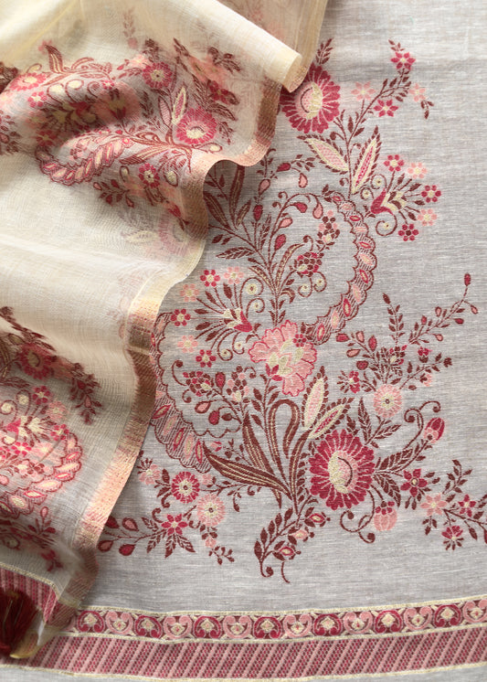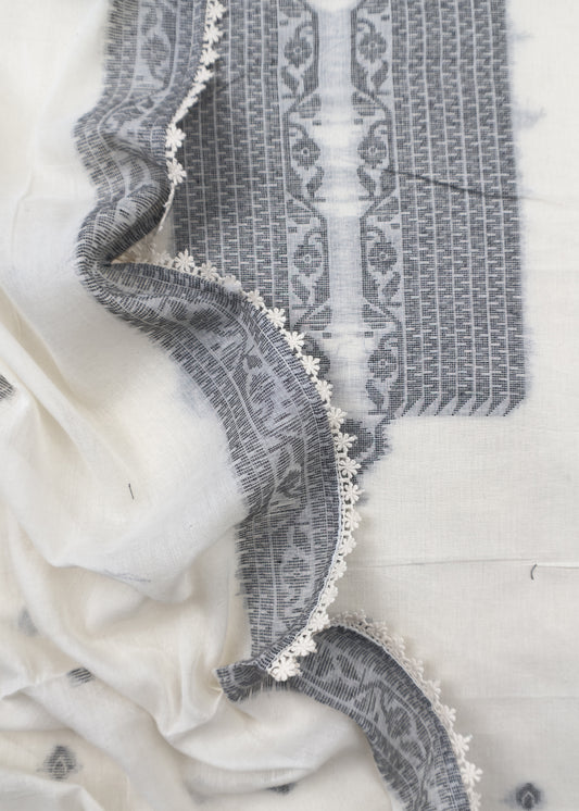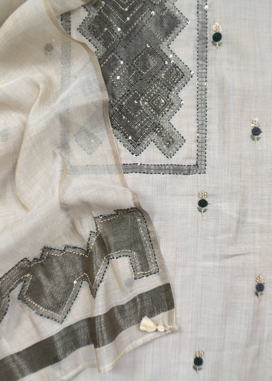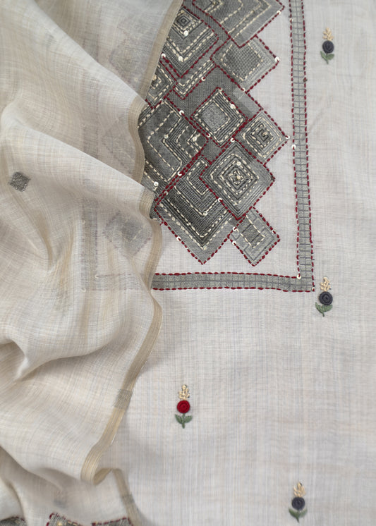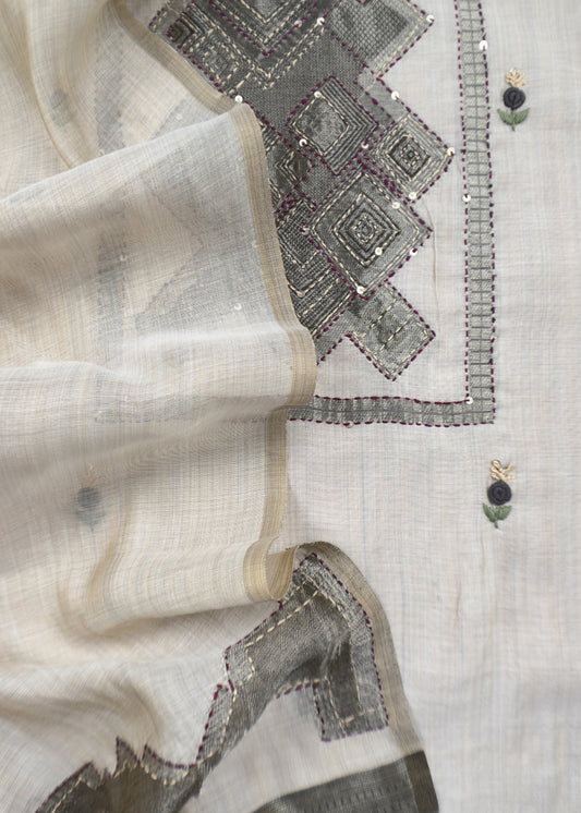 Off White With Gray Cotton Linen Suit With Jamdani Weaving