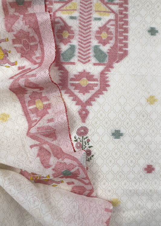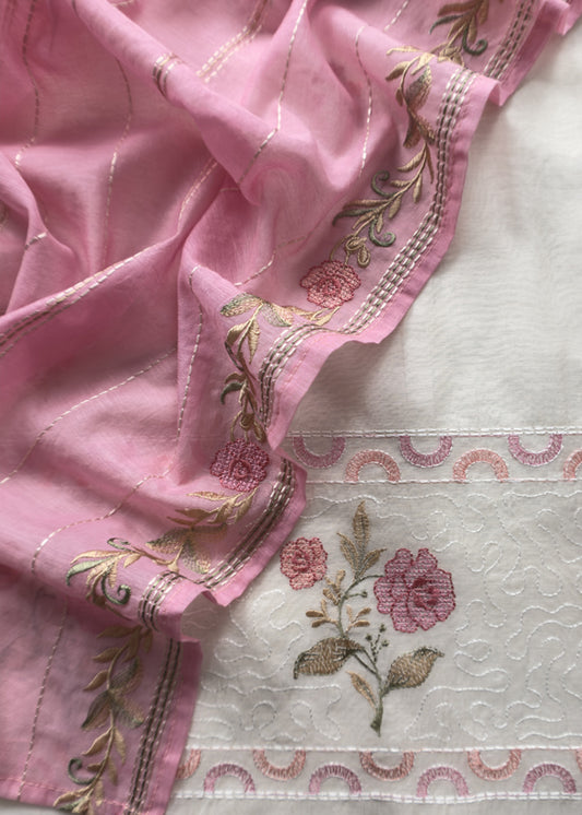 Off White With Pink Peach Embroidered Mul Chanderi Unstitched Suit