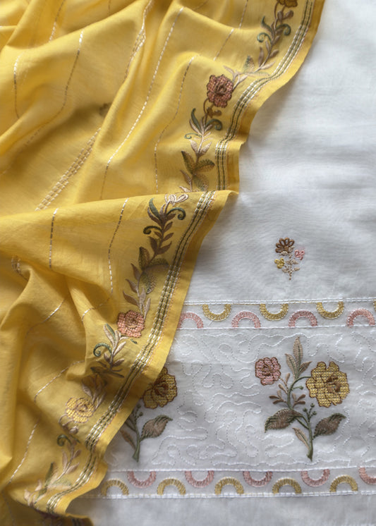 Off White With Yellow Pink Embroidered Mul Chanderi Unstitched Suit