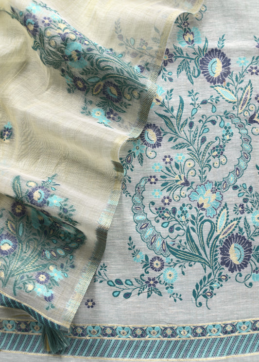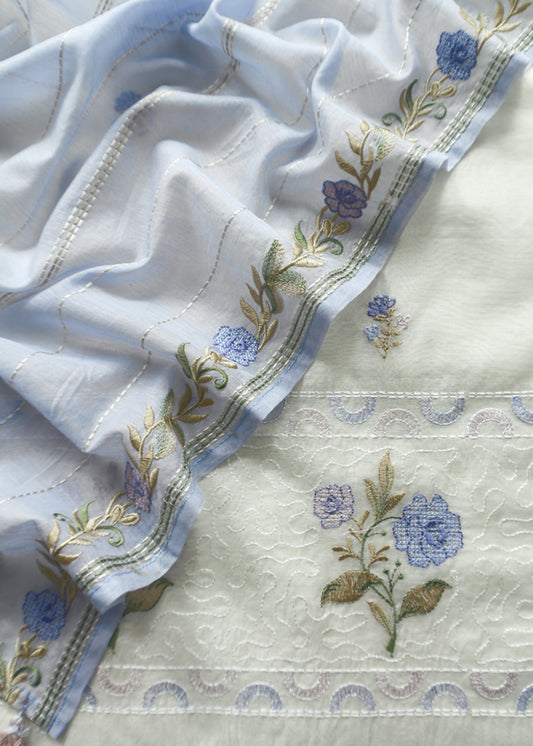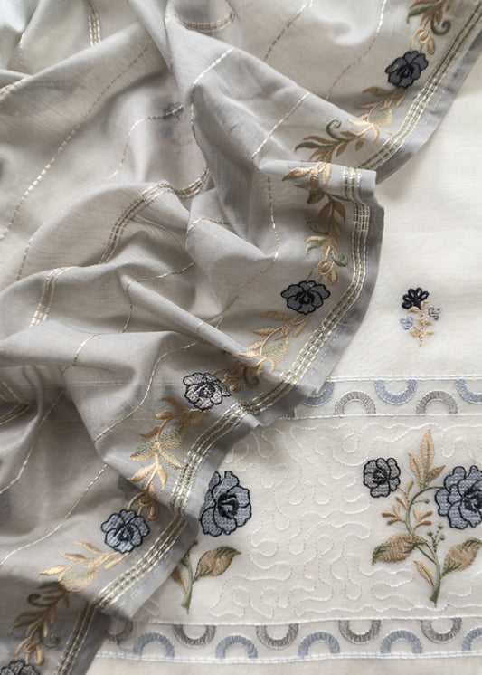 Off White With Grey Blue Embroidered Mul Chanderi Unstitched Suit