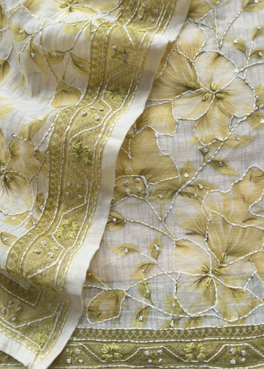 Off-White With Green Mulmul Suit With Hand Kantha Embroidery