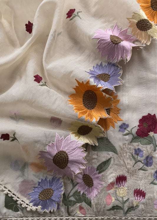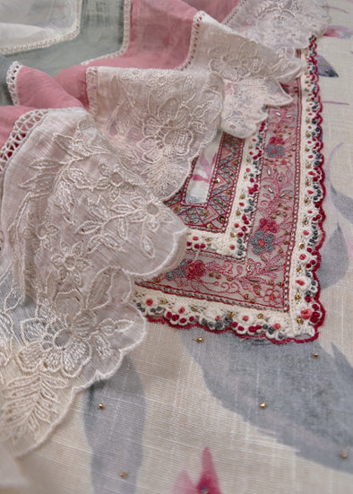 Off-White With Pink Linen Chanderi Suit With Hand Kantha Embroidery