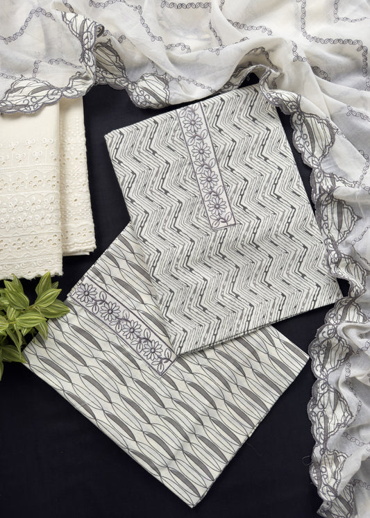 Off-White Embroidered Cotton Suit And Kota Dupatta With Patchwork