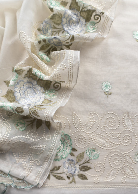 Off-White With Green Pure Mul Banarasi Cotton Suit With Resham Embroidery