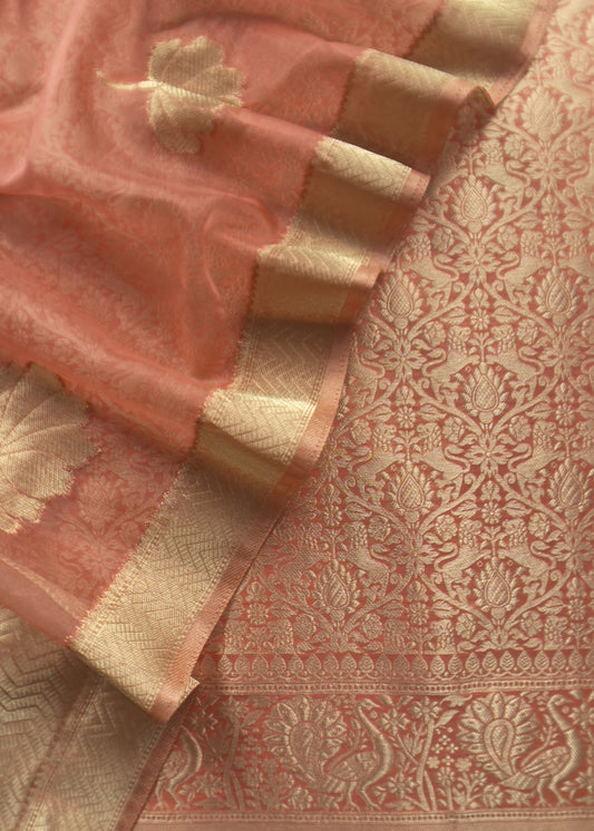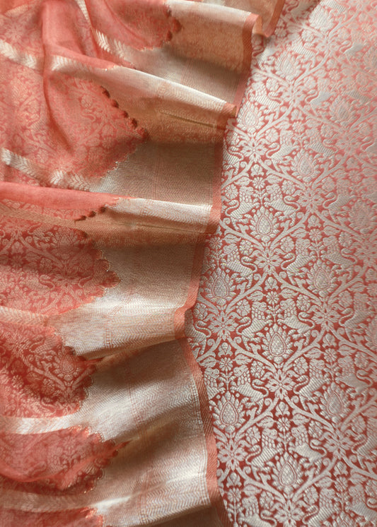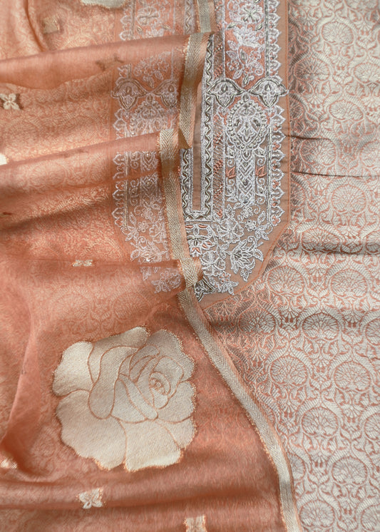 Orange Banarasi Silk Brocade Suit With Organza Dupatta