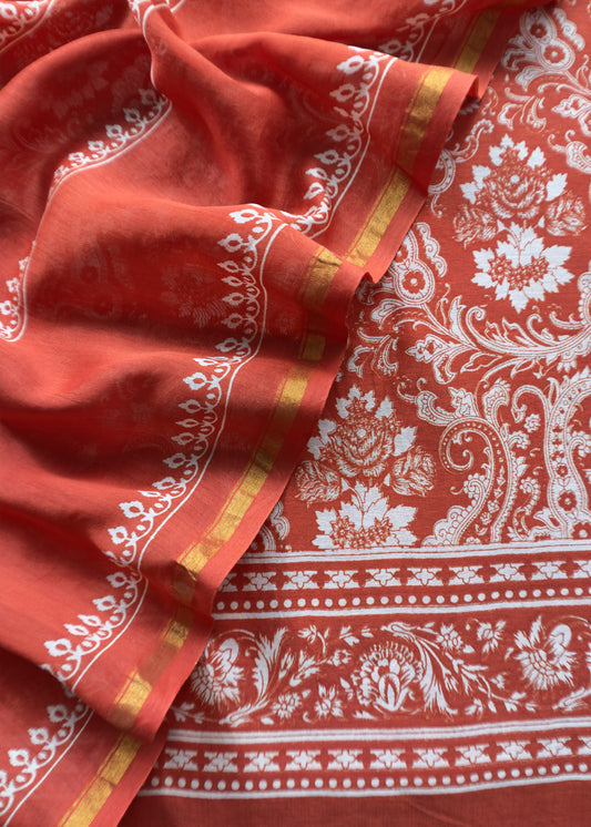 Orange Block Print Unstitched Suit In Pure Maheshwari Silk