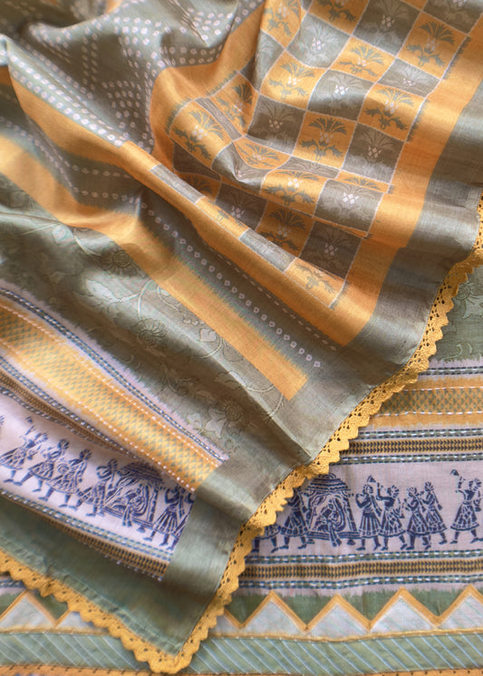 Olive Printed Unstitched Suit in Art Tussar Fabric