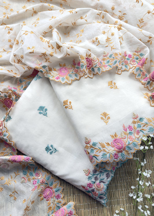 Off-White With Rose Mulmul Suit With Hand Kantha Embroidery