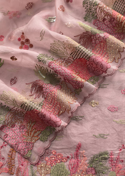 Orchid Pink Pure Organza Suit Fabric With Lake View Embroidery