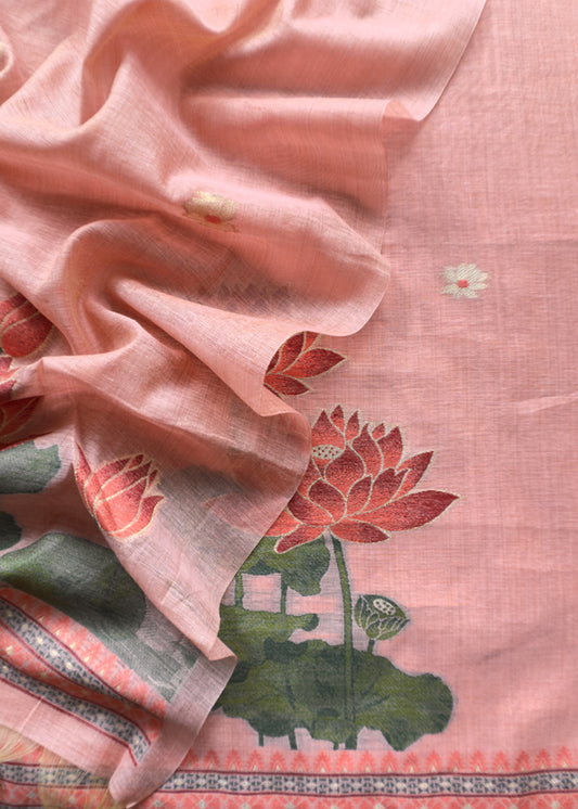 Orchid Pink Lotus Pichwai Jamdani Weaving Linen Chanderi Unstitched Suit