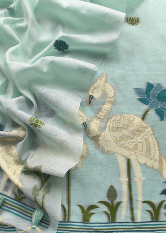 Pastel Blue Linen Chanderi Suit Fabric With Flamingo Jamdani Weaving