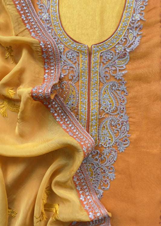 Orange Tissue Silk Suit Embraced With Gold Weaving