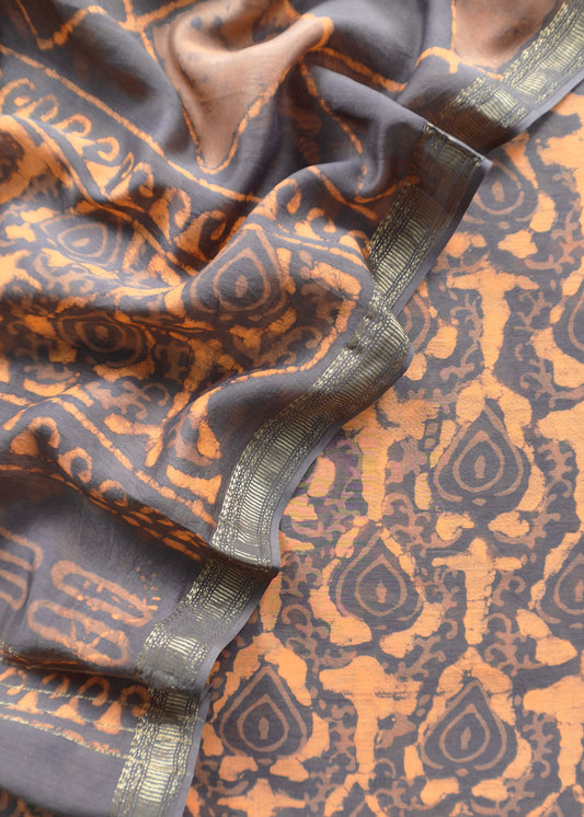 Orange With Brown - Sanganeri Block Printed Pure Chanderi Suit Fabric