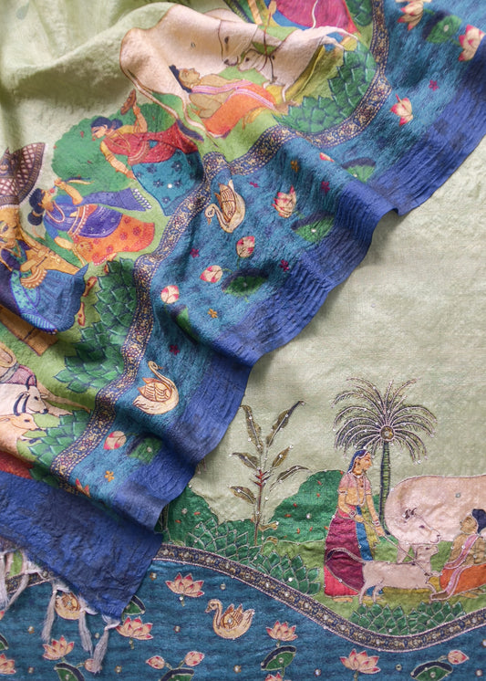 Pastel Green Tussar Silk Unstitched Suit With Pichwai Dupatta