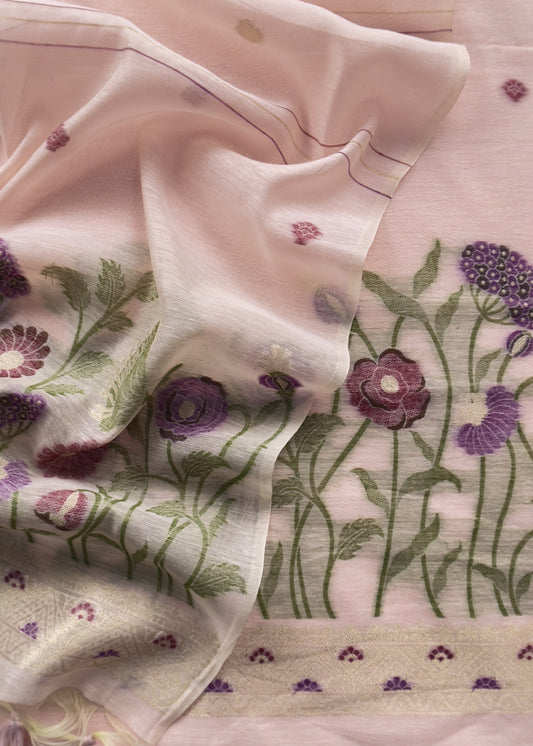 Pastel Pink Floral Jamdani Weaved Unstitched Suit In Linen Chanderi