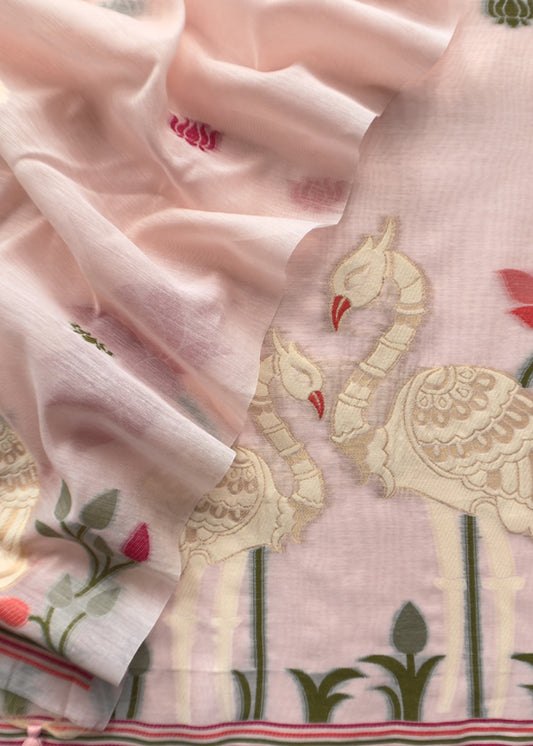 Pastel Pink Linen Chanderi Suit Fabric with Flamingo Jamdani weaving