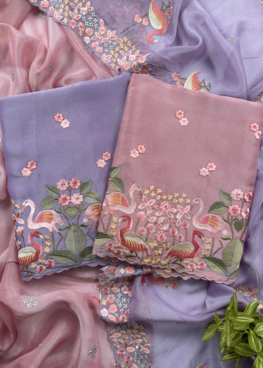 Pastel Pink Flamingo Embroidered Unstitched Suit In Tissue Silk