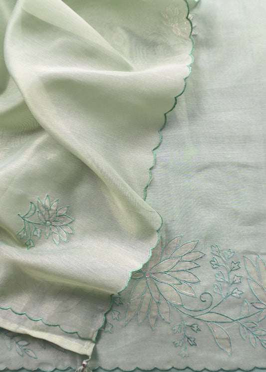 Pastel Green Unstitched Suit with Applique Work In Linen Tissue