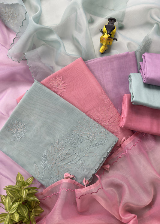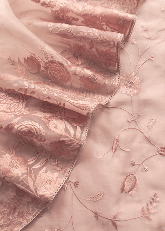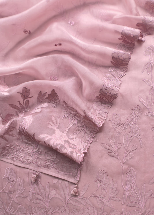Pastel Pink Pure Organza Silk Unstitched Suit With Flower Applique Work