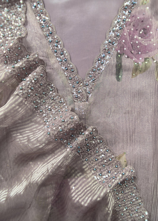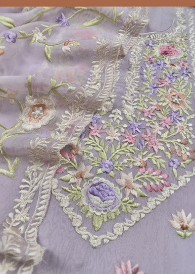 Pastel Purple Parsi Embroidered Unstitched Suit In Organza