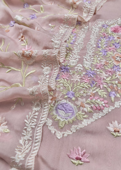 Pastel Pink Parsi Embroidered Unstitched Suit In Organza