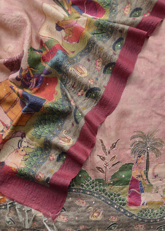 Pastel Pink Tussar Silk Unstitched Suit With Pichwai Dupatta