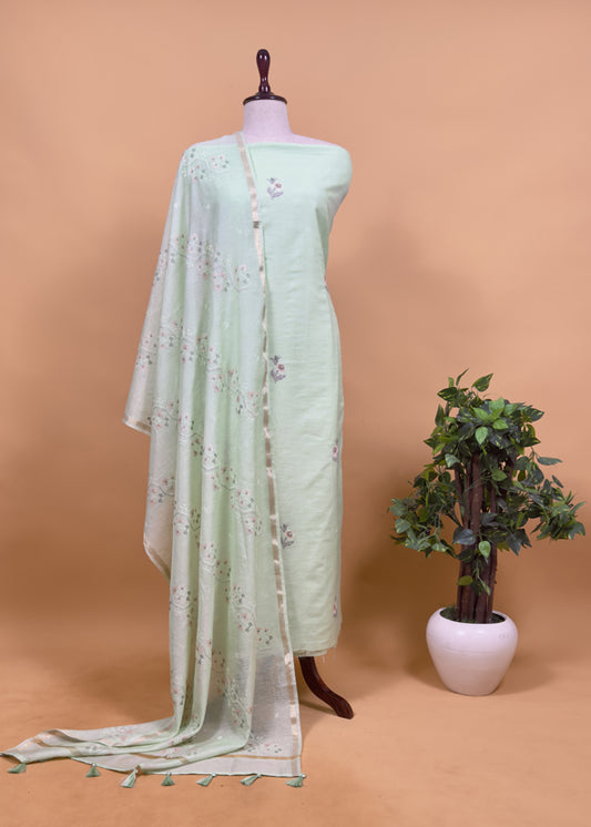 Pastel Pistachio Pure Mulmul Suit Fabric With Gold Tissue Silk Appliqué Work