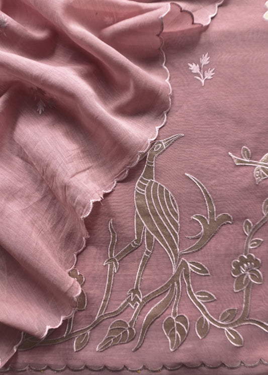 Pastel Pink Pure Mul Chanderi Suit With Chidiya French Thread Embroidery