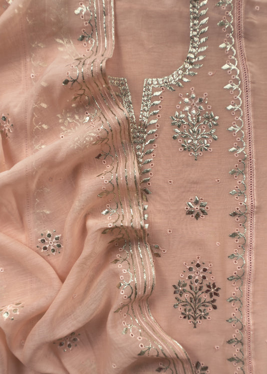 Peach Blush Handloom Mul Chanderi Suit With Gold Pitta Hand Work And Embroidery