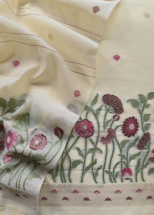 Pastel Yellow Floral Jamdani Weaved Unstitched Suit In Linen Chanderi