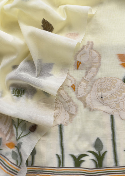 Pastel Yellow Handloom Mul Suit With Peacock Resham Bharwa Embroidery