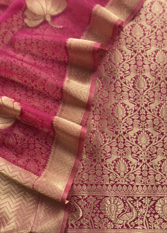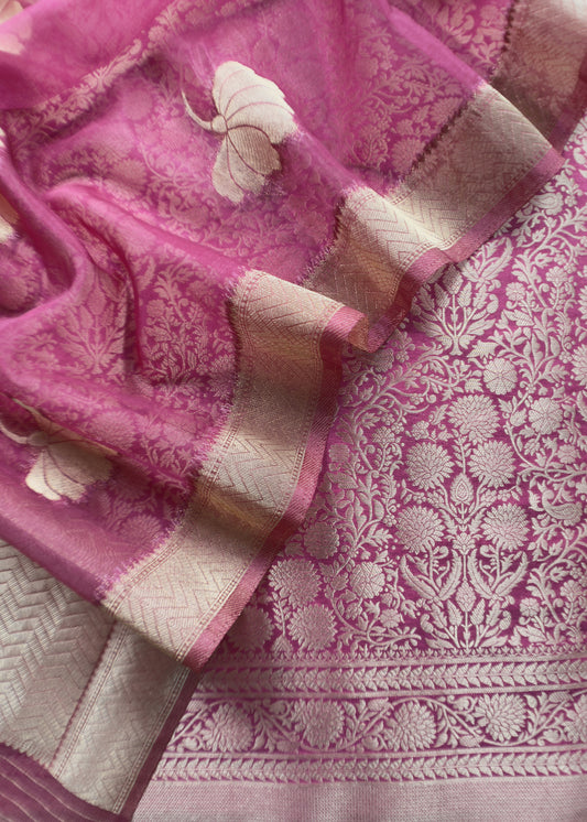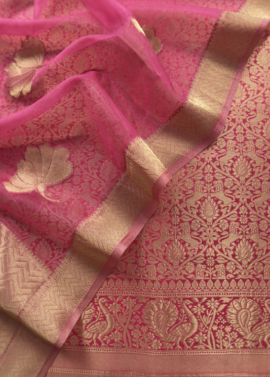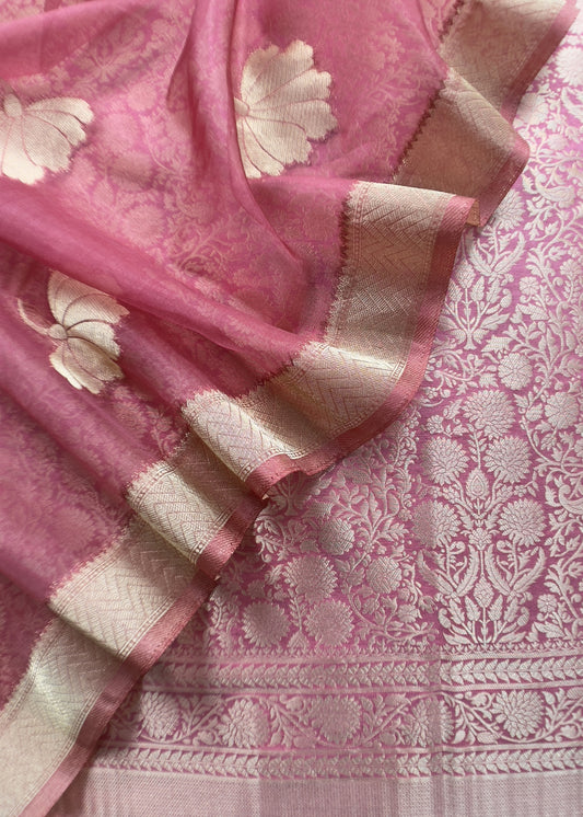 Pink Banarasi Silk Brocade Suit With Organza Dupatta