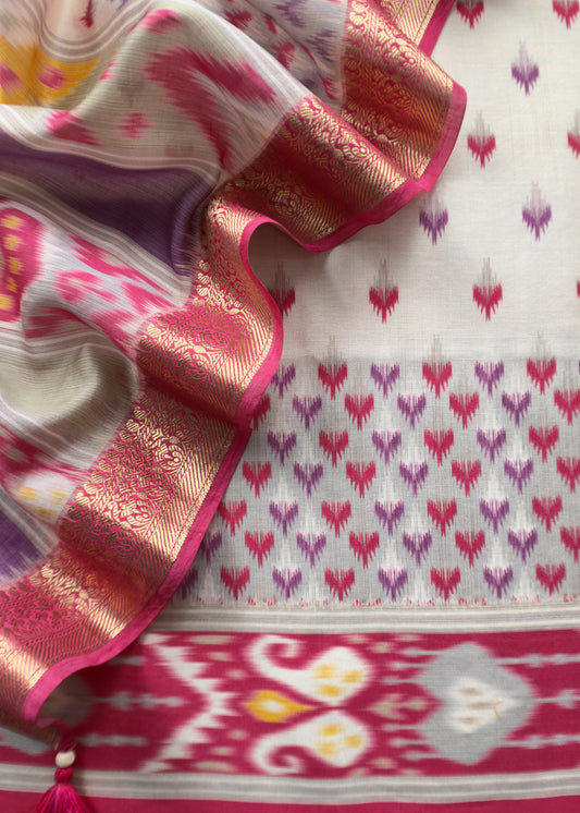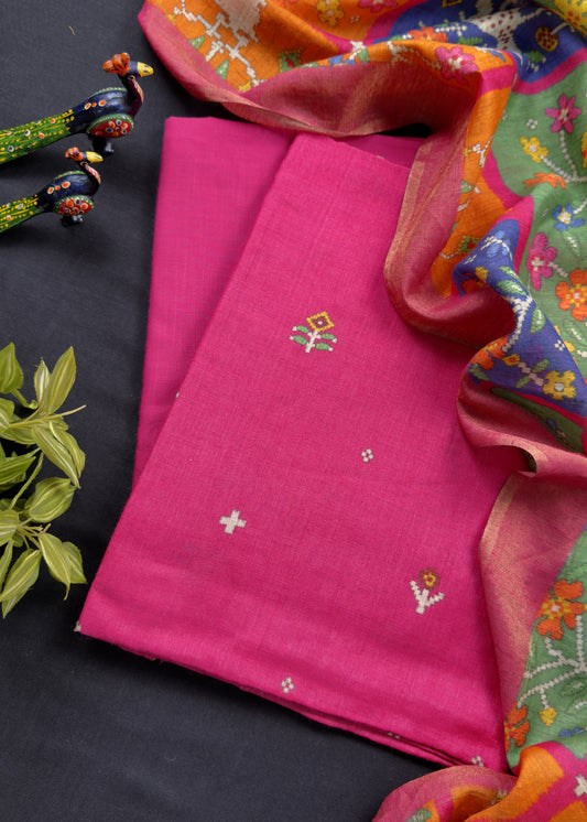 Pink Punch Handloom Ikkat Chanderi Suit Fabric With Maheshwari Border