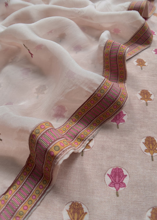 Pink Pearl Chanderi Unstitched Dupatta-Suit With Silver Gold Zari Jamdani Weaving