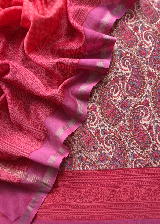 Pink Paisley Block Print Pure Maheshwari Silk Unstitched Suit