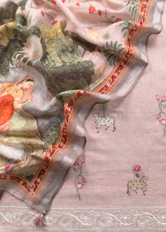 Pink Muslin Unstitched Suit With Embroidered Dupatta