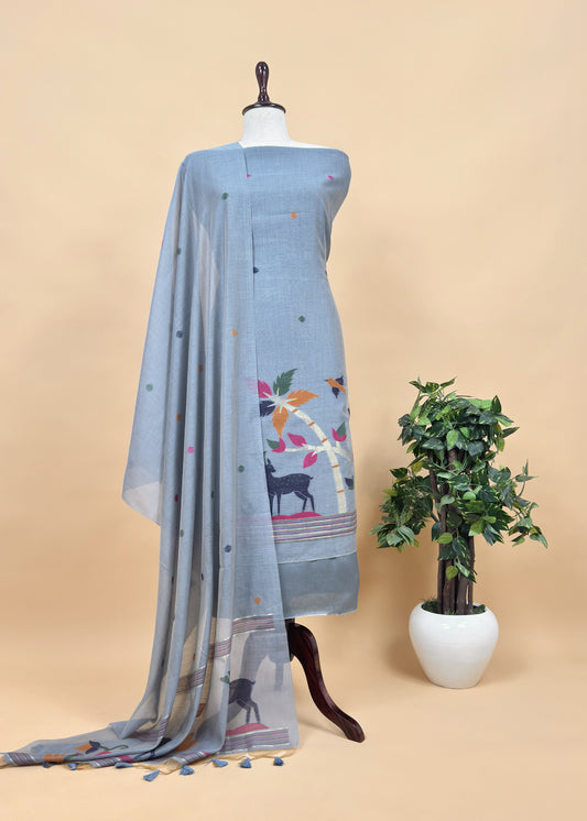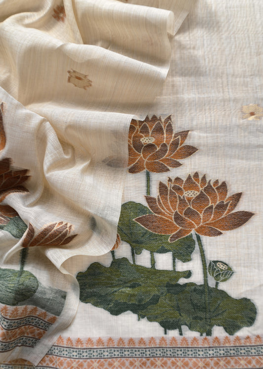 Ivory Lotus Pichwai Jamdani Weaving Linen Chanderi Unstitched Suit