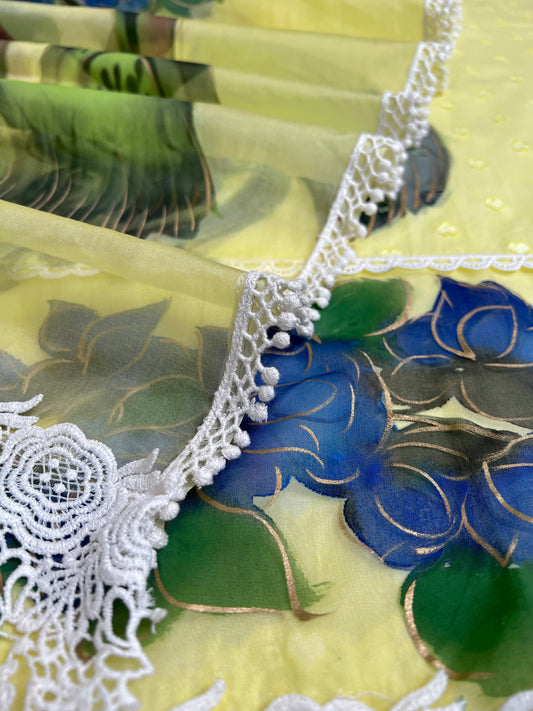 Yellow Pakistani Unstitched Suit In Mulmul Cotton With Organza Dupatta