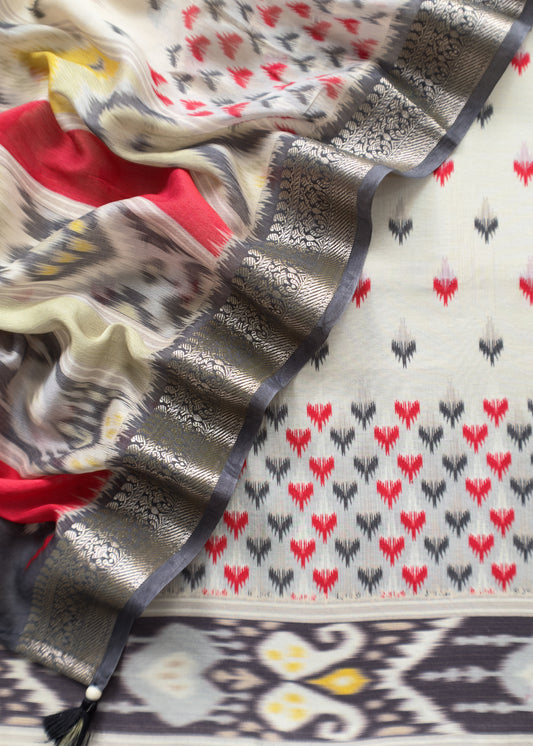 White And Red Handloom Ikkat Chanderi Suit Fabric With Maheshwari Border