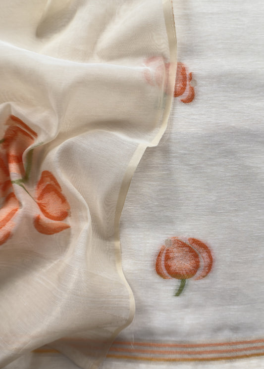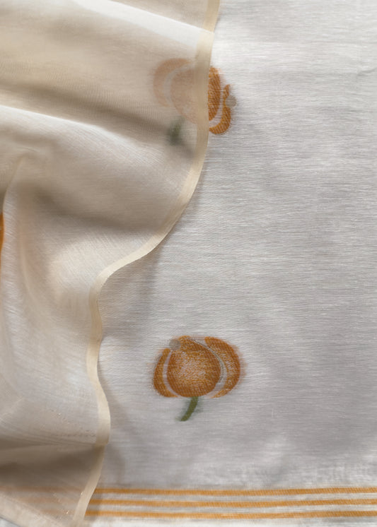 Off White Jamdani Suit With Orange Daffodil In Linen Chanderi Fabric