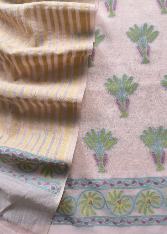 Pastel Green Pure Kota Suit Fabric with Cross Stitch Embroidery