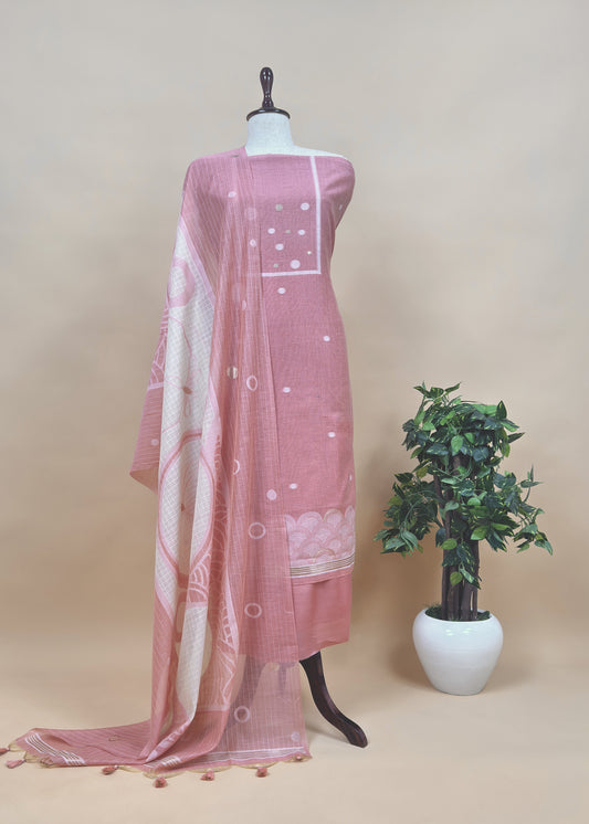 Off-White Pure Cotton Linen Hand Block Print Suit Fabric With Jamdani Weaving
