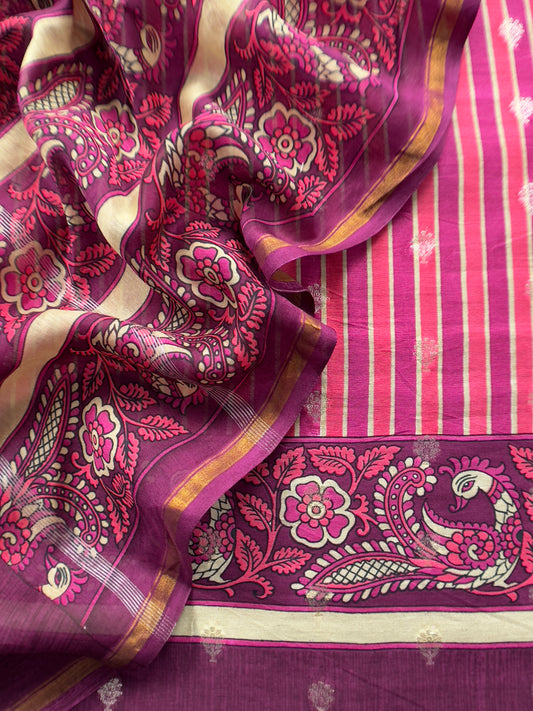 Wine Pure Maheshwari Silk Unstitched Suit fabric with Banarasi bootis and Kalamkari print