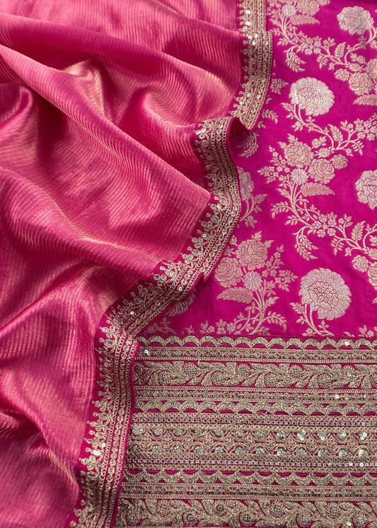 Neon Pink Handloom Banarasi Unstitched Suit In Kora Tissue Silk
